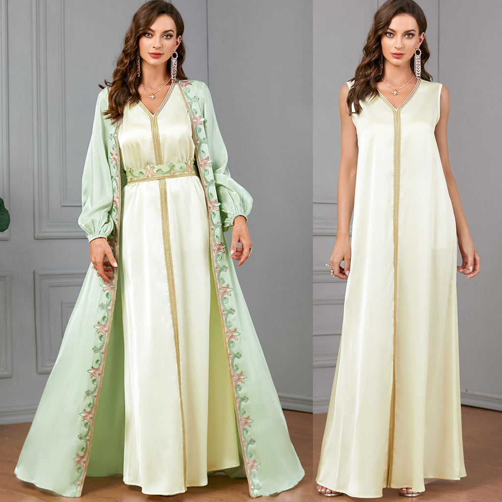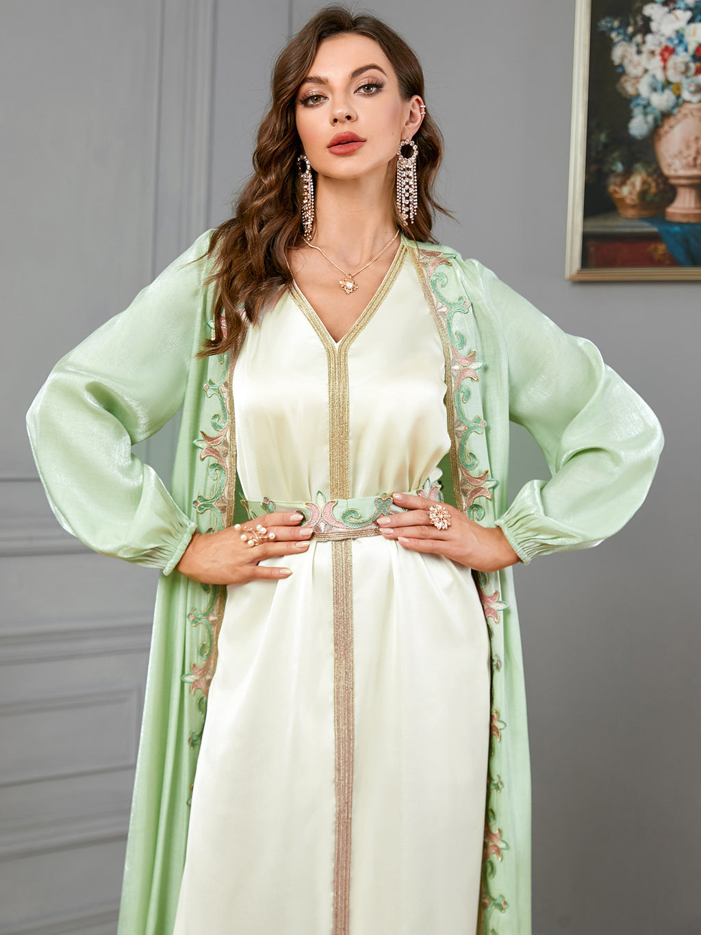 Feel like royalty wearing the Women's Long Sleeve Mint and Cream Maxi Gown featuring a robe-like covering and dotted with gentle pink floral details.