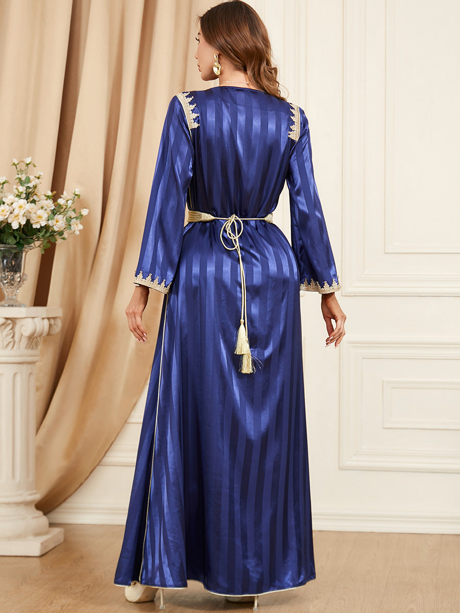 Feel like royalty in the luxurious Women's Long Sleeve Shimmery Maxi Dress. It comes in your choice of crimson, light blue and dark blue with golden trim.