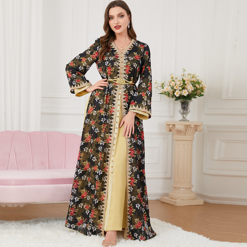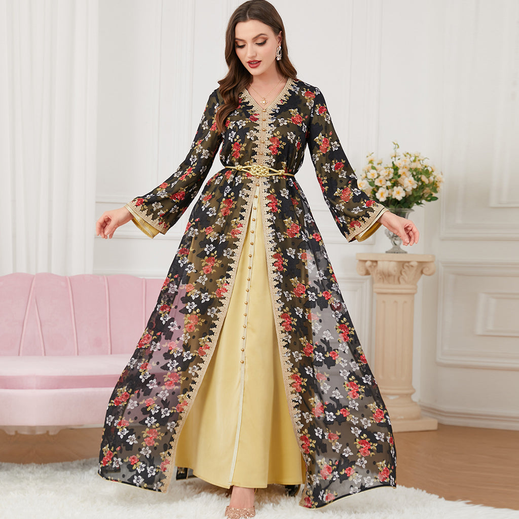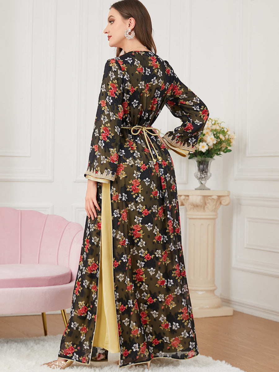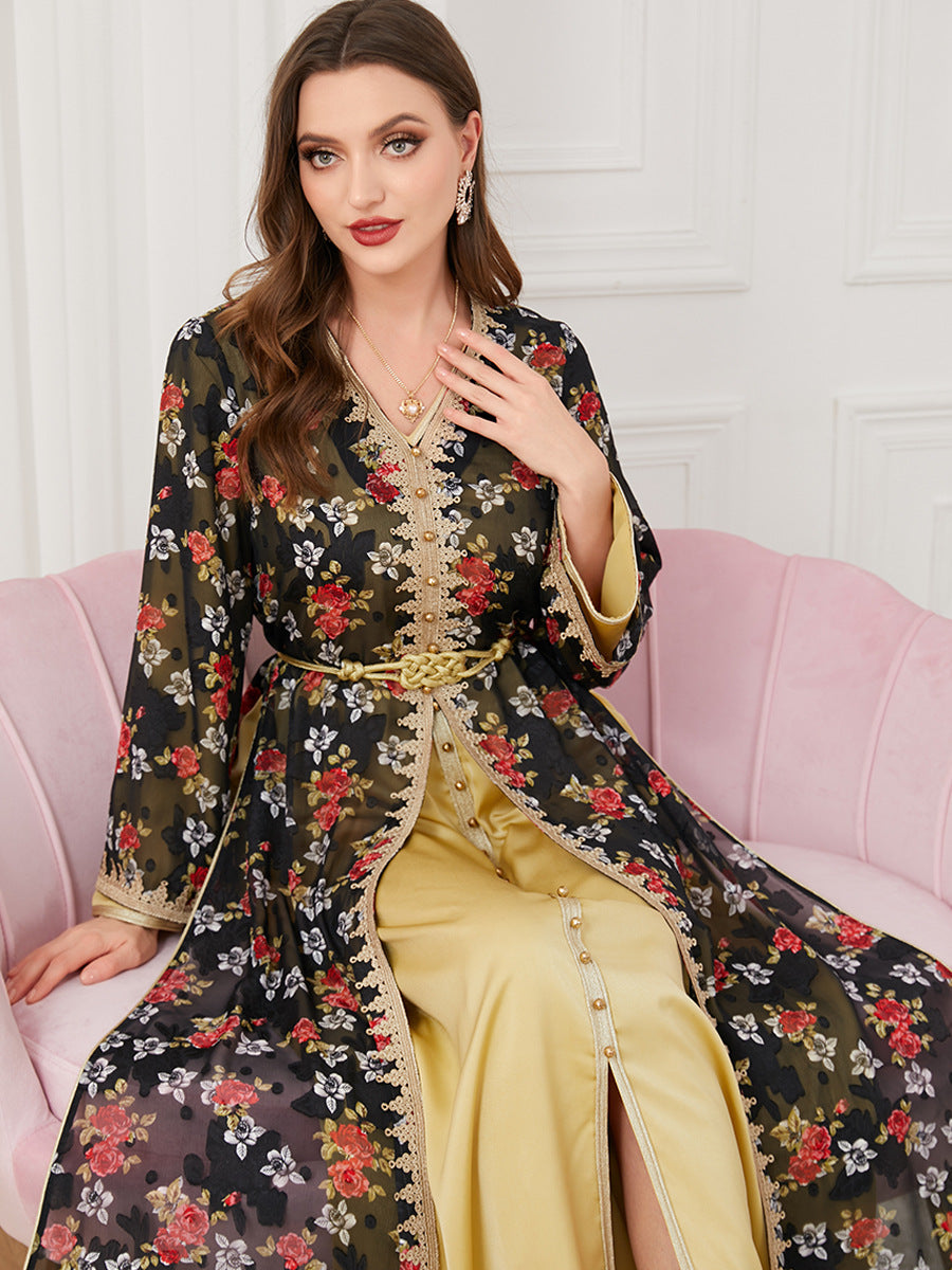 Wearing the Women's Long Sleeve Floral Print Robe Dress, you’ll look sophisticated at any function. This dress features gold highlights to give it a regal finishing touch.