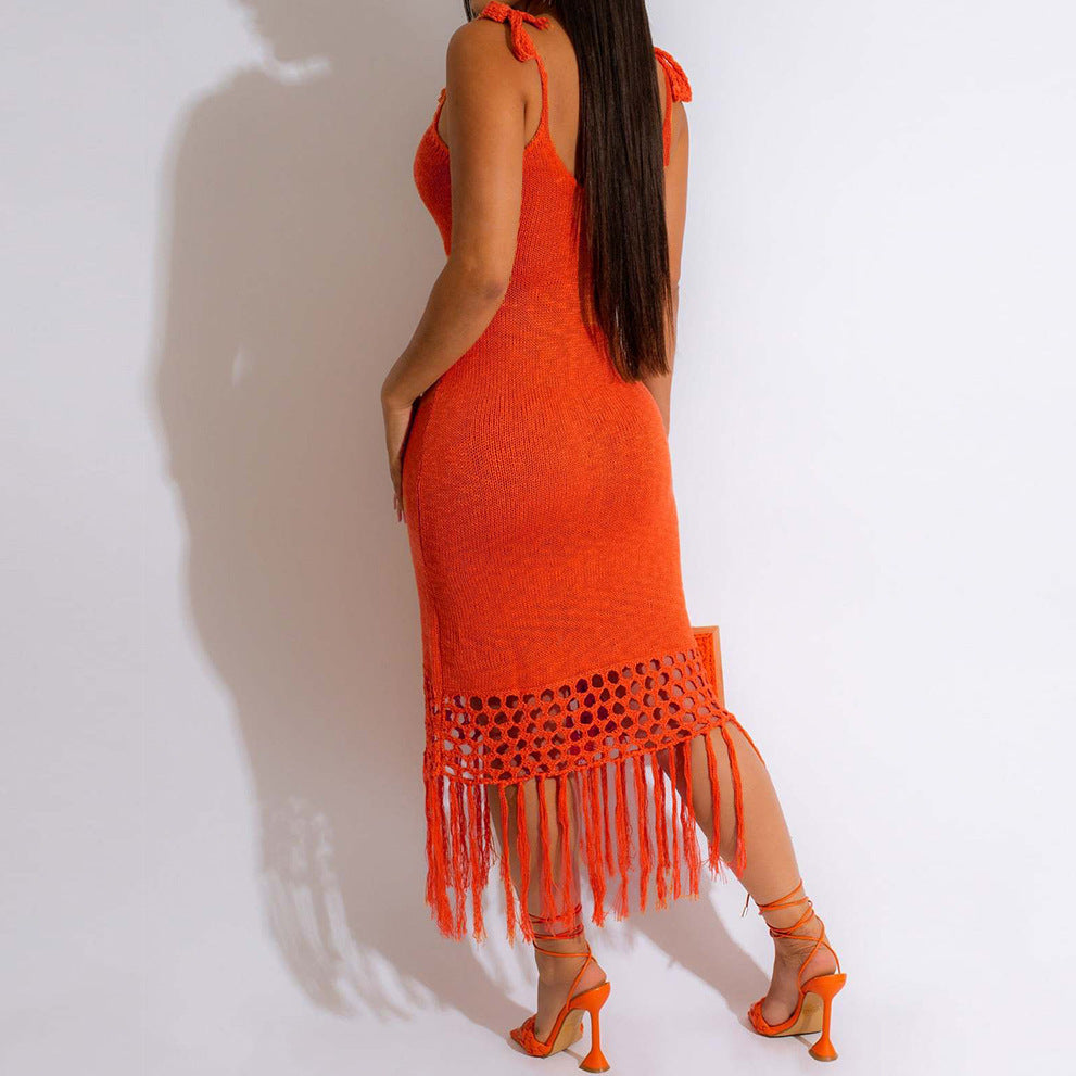 Catch the eye of passersby wearing the Women's Strappy Maxi Dress with Netting and Tassels. It stands out with the uniquely textured net hem that sways when you walk.