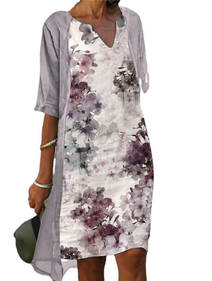 Gaun rok cetak bunga wanita dengan set lengan panjang tiga seperempat dan set Duster adalah pilihan kasual untuk musim semi dan musim panas. Muncul dalam rona netral ungu keabu-abuan dan biru untuk Anda pilih.