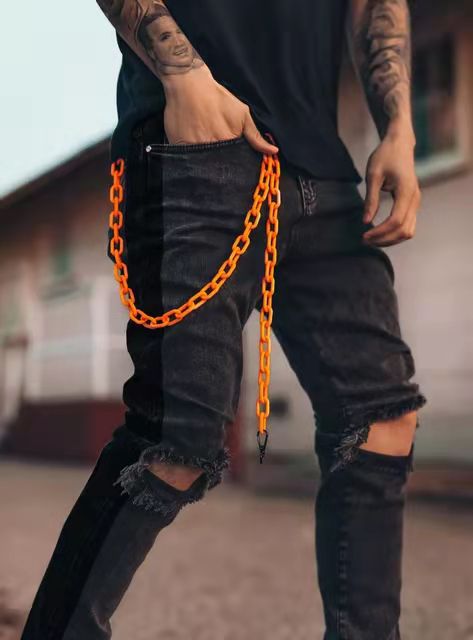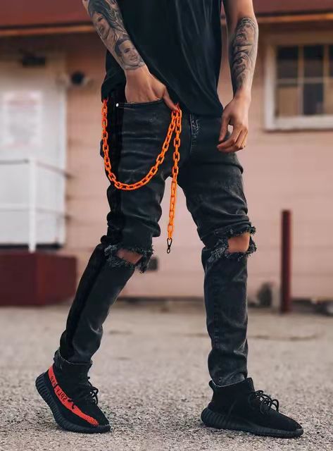 Catch the eye of passersby on the street wearing the attention grabbing Men’s Skinny Jeans with Ripped Knees and Vibrant Orange Chain that are sure to turn heads.