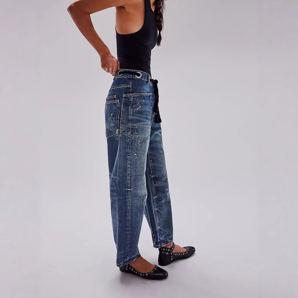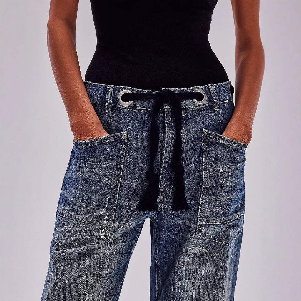 Inietta creatività nel tuo guardaroba con questi jeans a fit con un design astratto di splash-wink. La vita con coulisse aggiunge comfort e flessibilità a questa silhouette casual rilassata. Ottimo per il tocco di stile o il weekend freddo abbigliamento.
