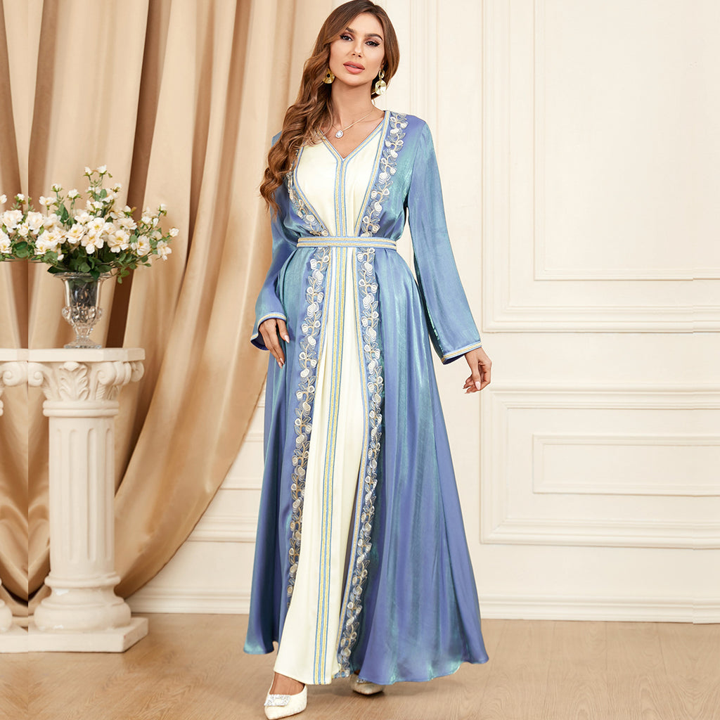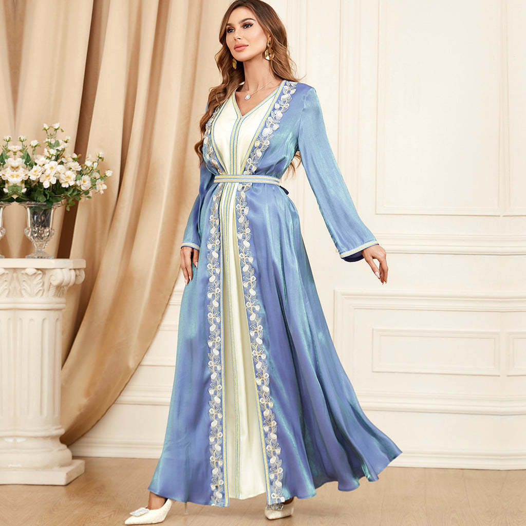 The Women's Light Blue and White Long Sleeve Maxi Dress makes the perfect ensemble for spring and summer with its lightweight and shimmery material.