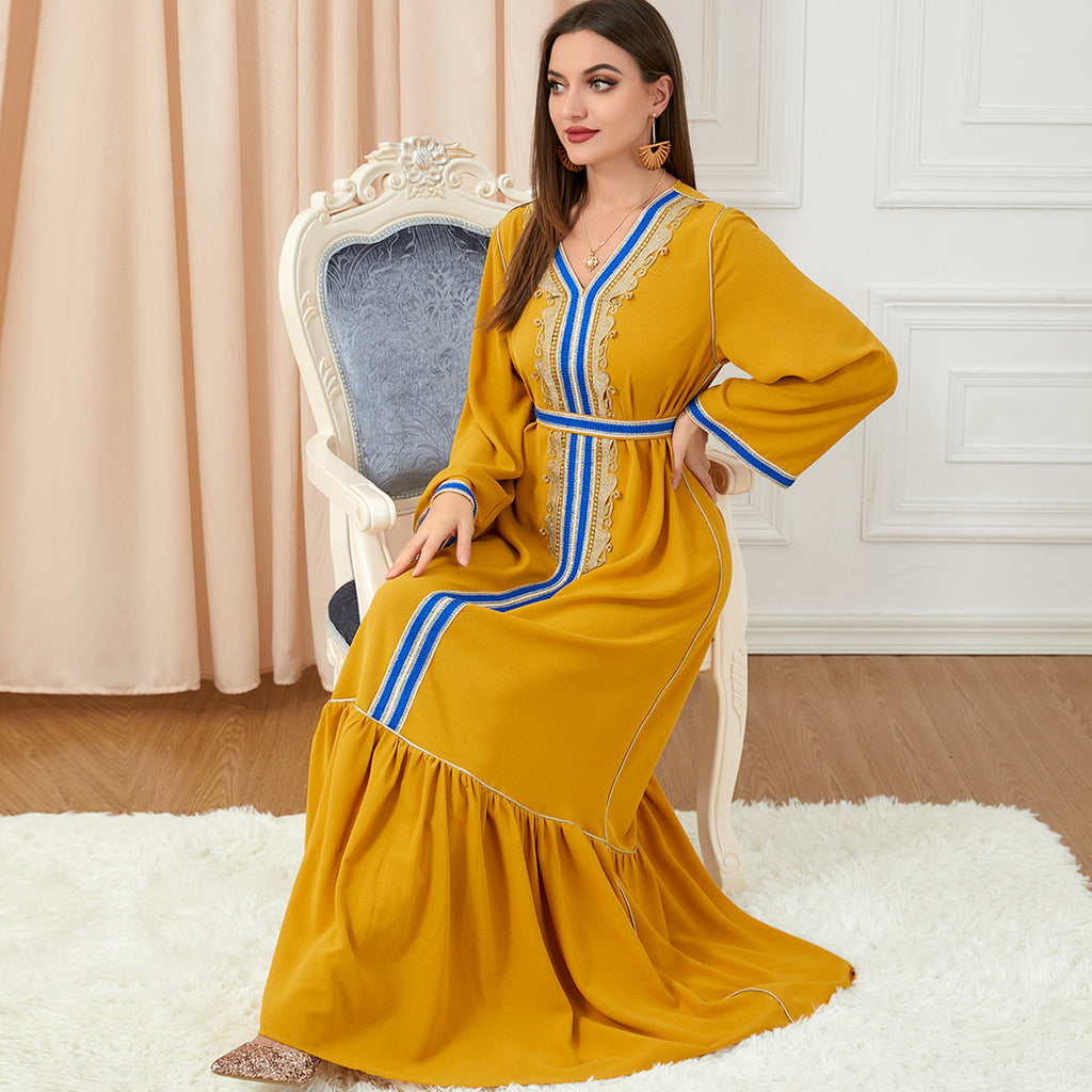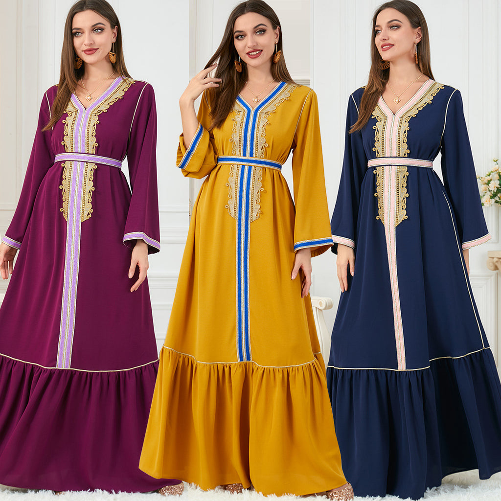 Add a royal touch to your nighttime ensembles with the Women's Velvety Blue Long Sleeve Maxi Dress featuring pink, gold and white detailing in the front.