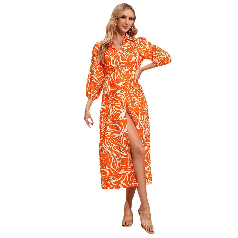 Catch the eye of everyone at the party wearing the Women's Long Sleeve Midi Dress with Turn Down Collar. It features your choice of a vibrant orange or green pattern.