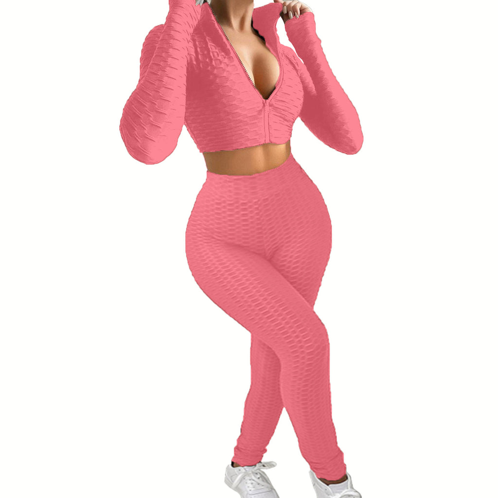 女性の2ピースのクロップトップとレギンスセットを着て、運動中や自宅でリラックスしながら最高の見方をしてください。デザインはユニークなネットテクスチャを備えており、さまざまな色があります。