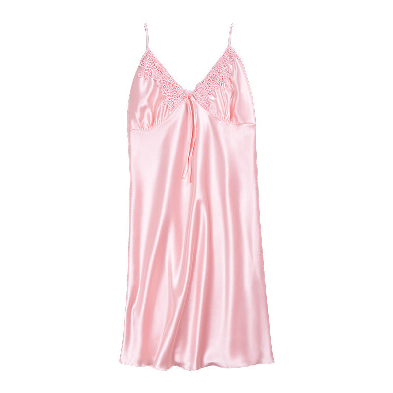 レイシーのVネックとミニの長さの裾を備えたこの女性用スリップドレスは、睡眠のためのキュートでシックなアパレルです。さまざまな色の選択肢があり、そのすべてがわずかな光沢を持っています。