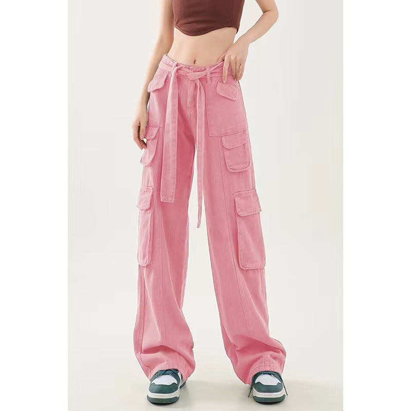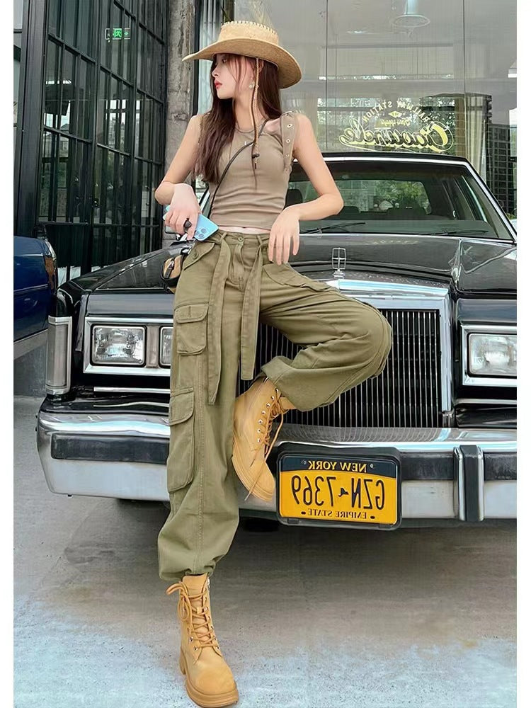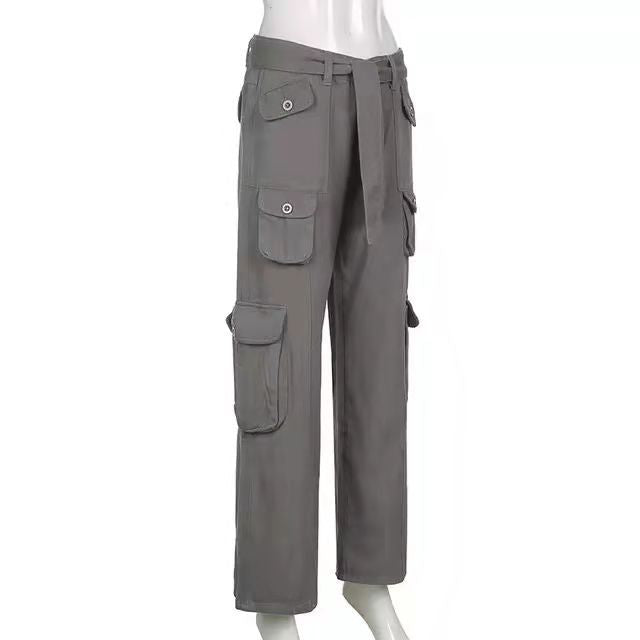 Dames met hoge taille losse passende broek met ladingzakken en stropdas taille