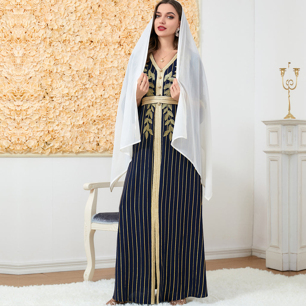 Geavanceerde en chic, de damesblauwe maxi -jurk met lange mouwen met verticale strepen heeft een eenvoudige gouden bladdecoratie langs het lijfje.