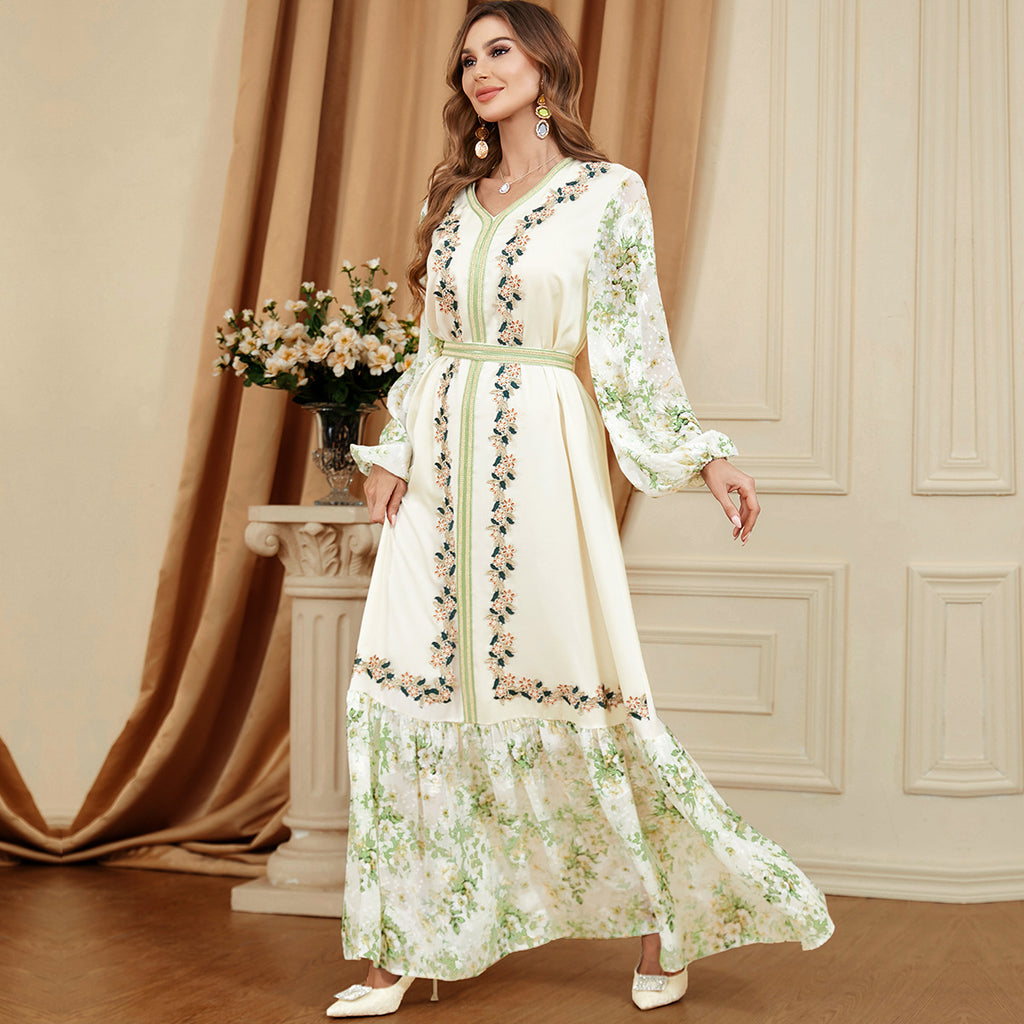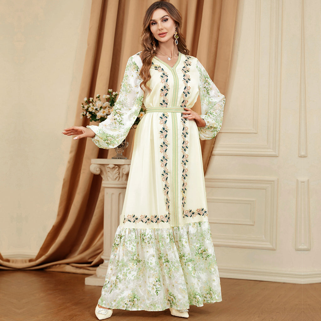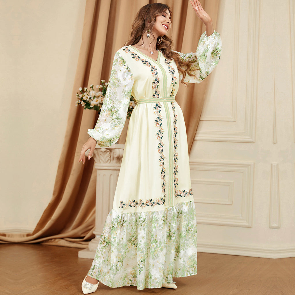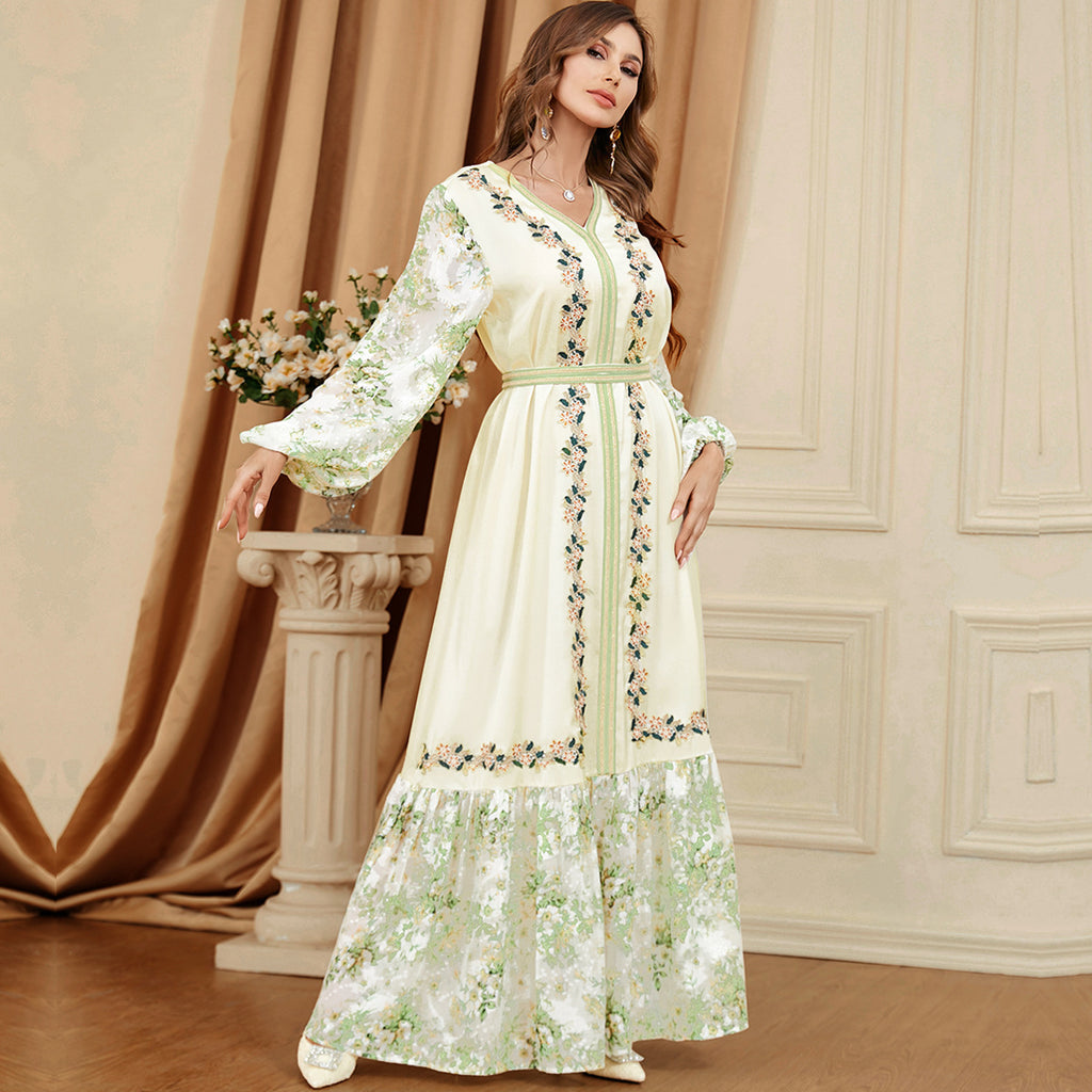Dames met lange mouwen los passende groene en witte botanische jurk