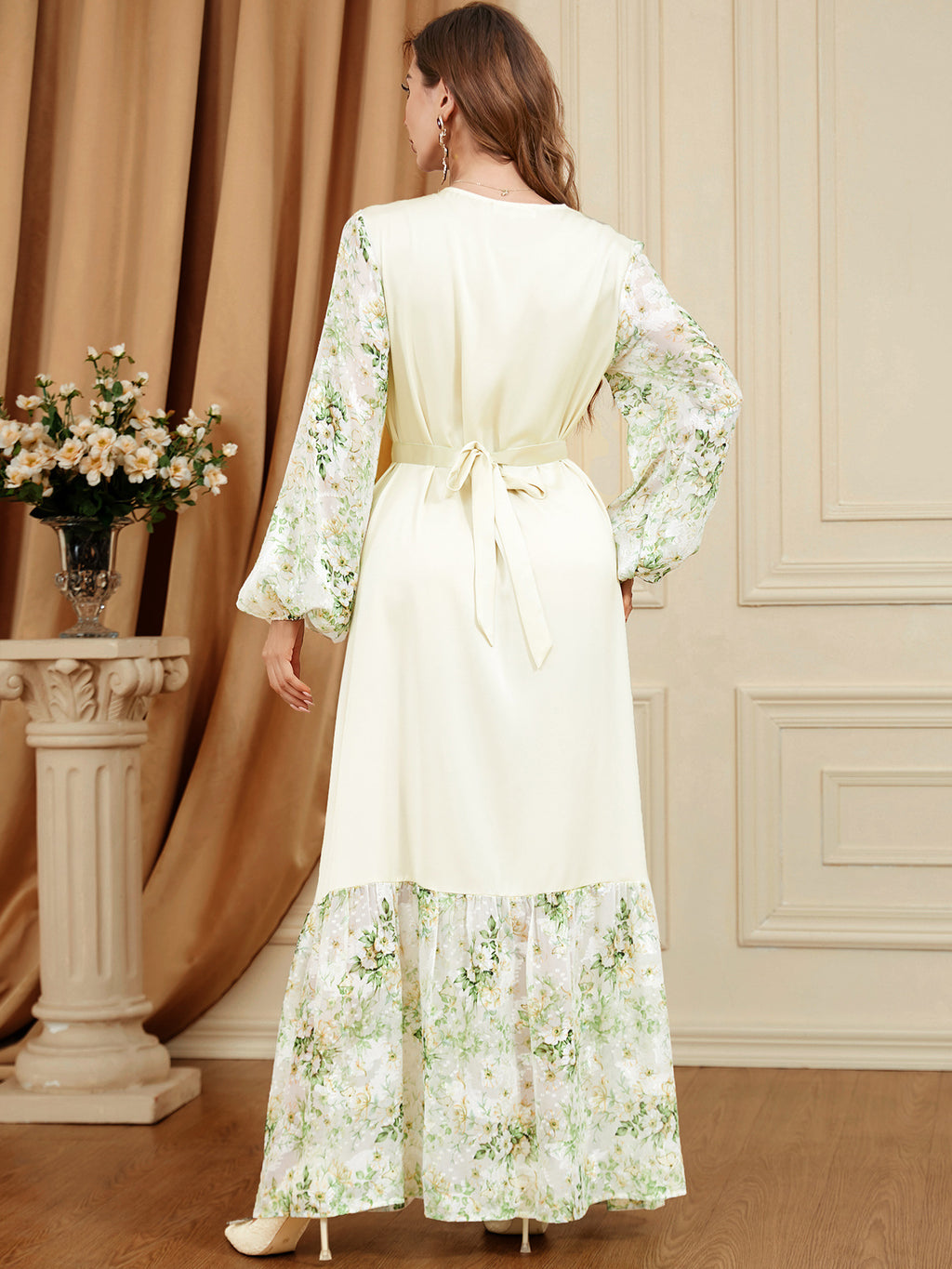 Maak je klaar voor de lente met de losse fitting groene en witte botanische jurk met lange mouwen met de dames met groene bladeren en roze bloemen over de stof.