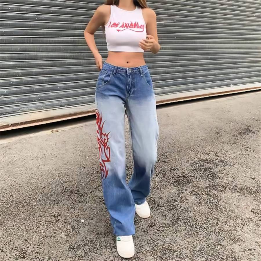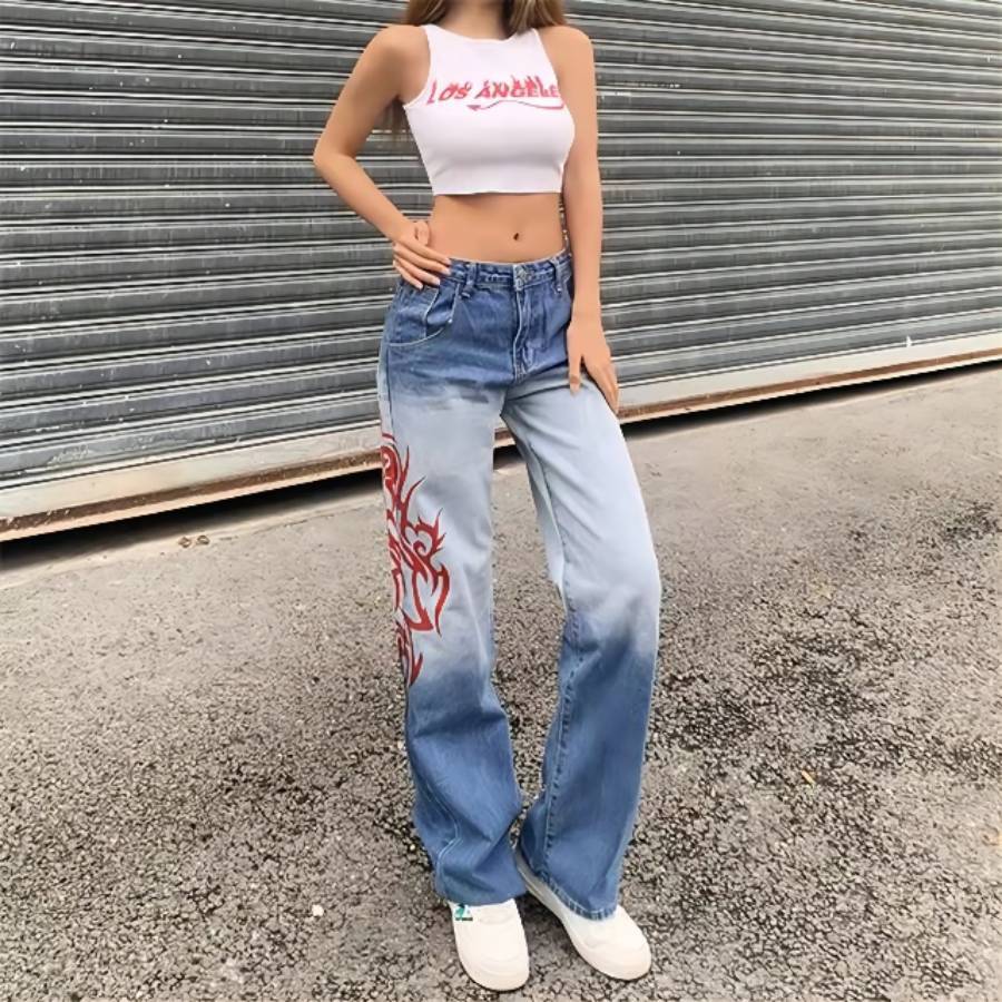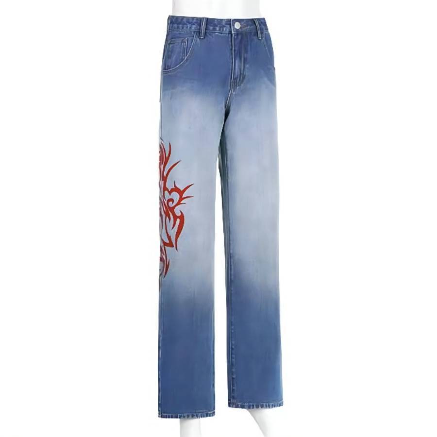 Women’s High Waist Denim Jeans with Red Patterning