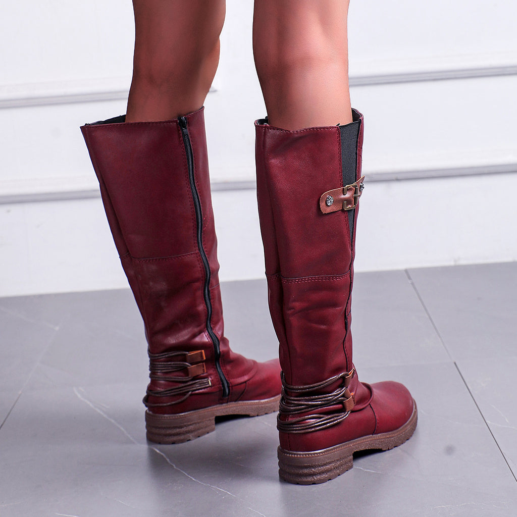 Women's Knee High Leather Boots with Buckle and Zip Up Side