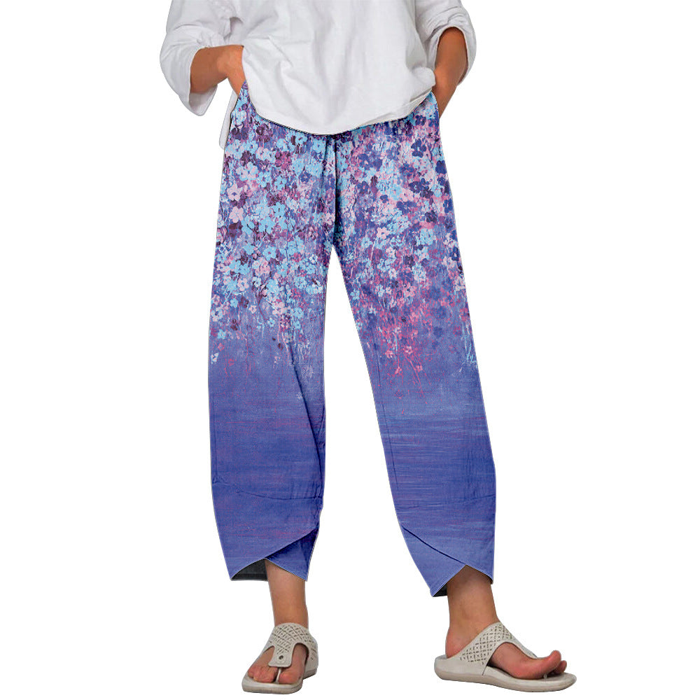 Volte no estilo usando essas calças de tornozelo solto de impressão floral única com uma impressão floral do quadril até os joelhos e estão disponíveis em sua escolha de cores.