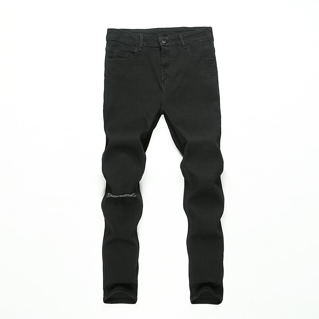 Keep it casual wearing the Men’s Tight Skinny Jeans with Ripped Knees in Black. These versatile pants work well with any color or style of top, making them a great staple piece.