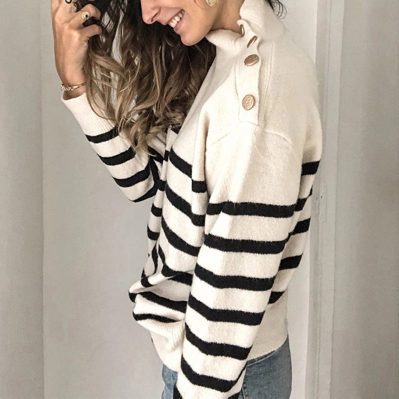 女士的長袖條紋襯衫帶有紐衣櫃是一個可愛的補充。它具有四種顏色之一,並具有水平條紋圖案以及肩膀上的小按鈕。