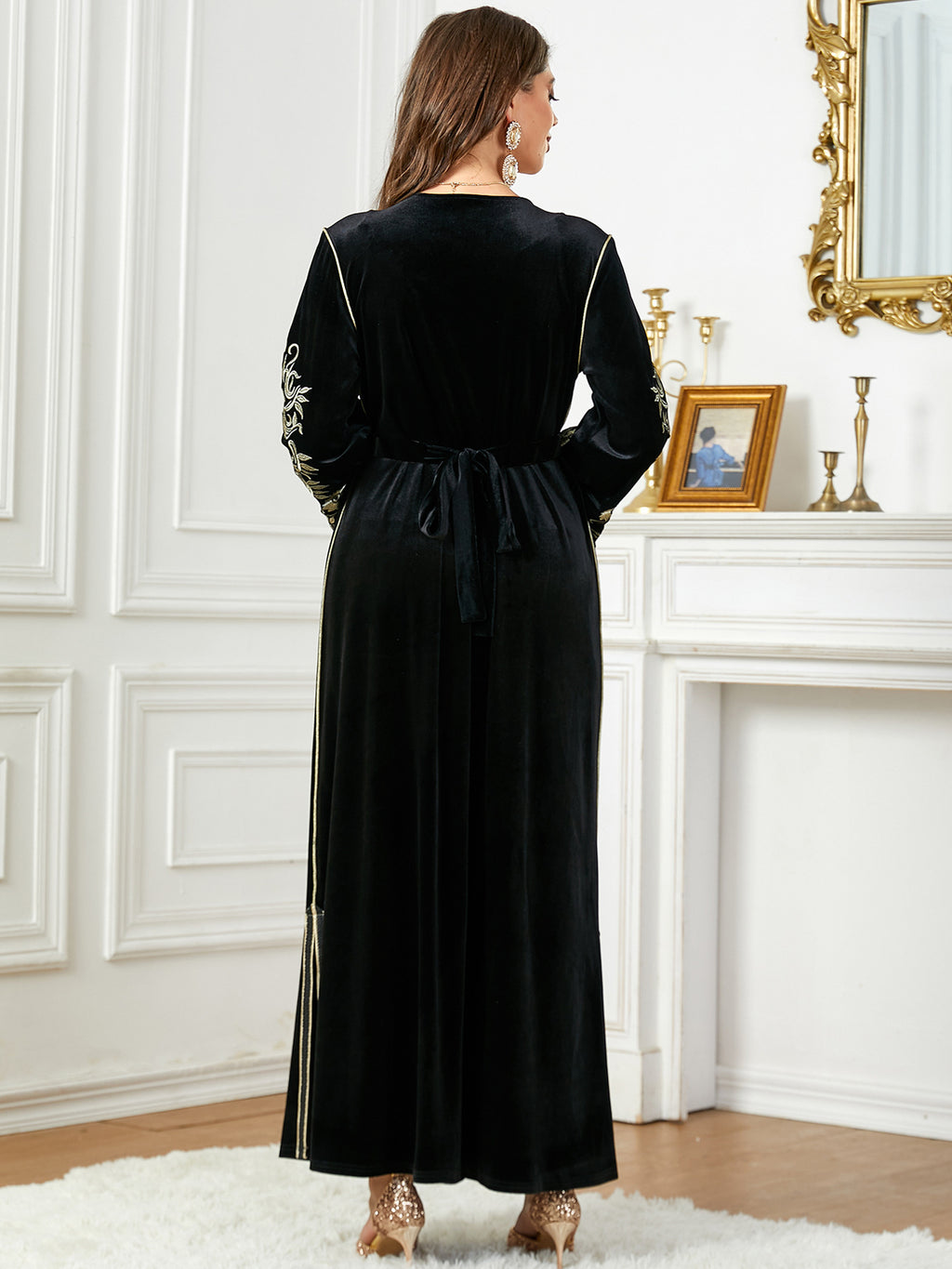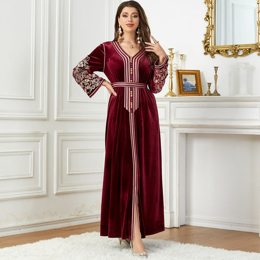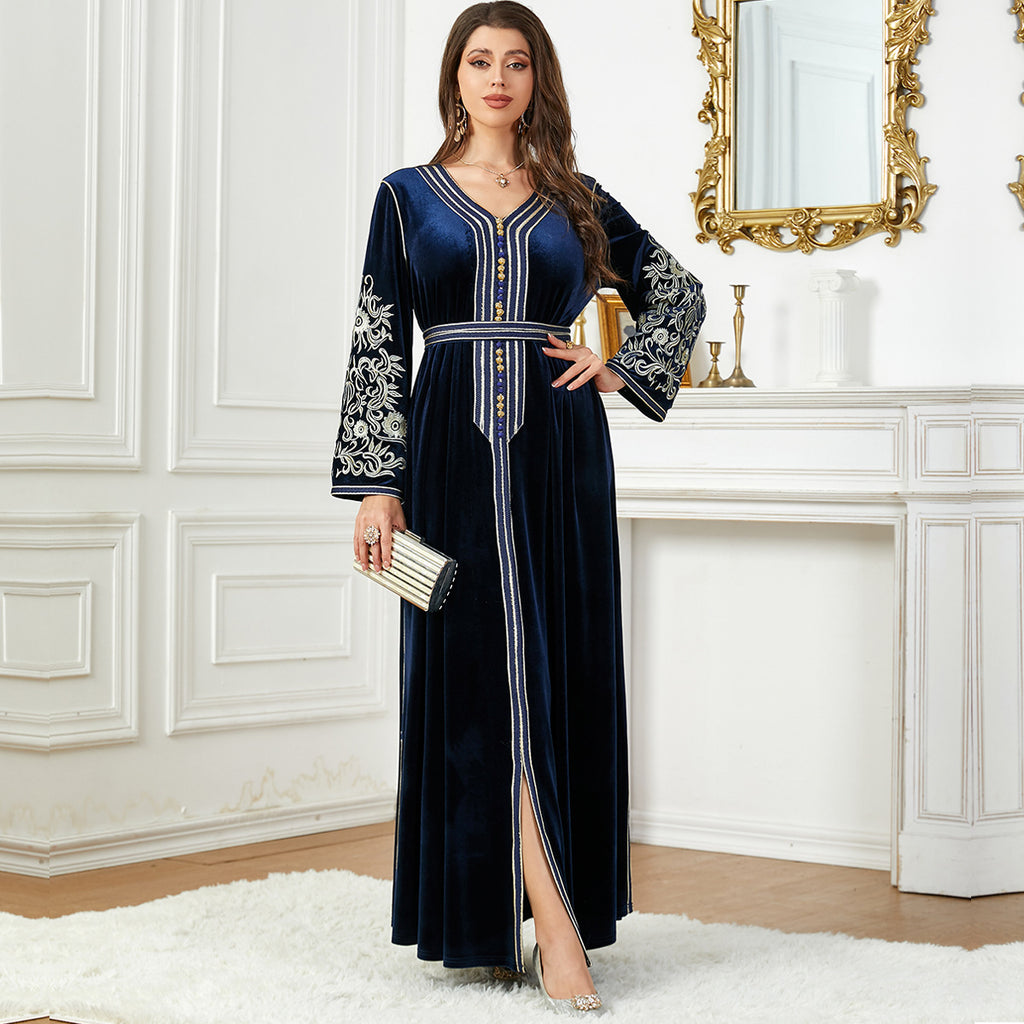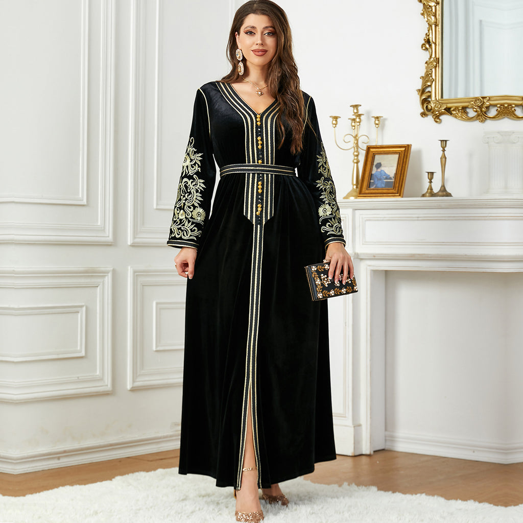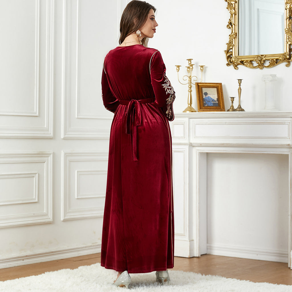 Women's Long Sleeve Velvet Maxi Dress with Gold Detailing