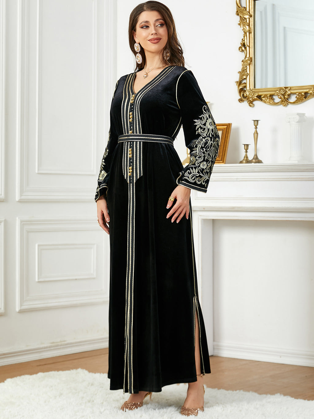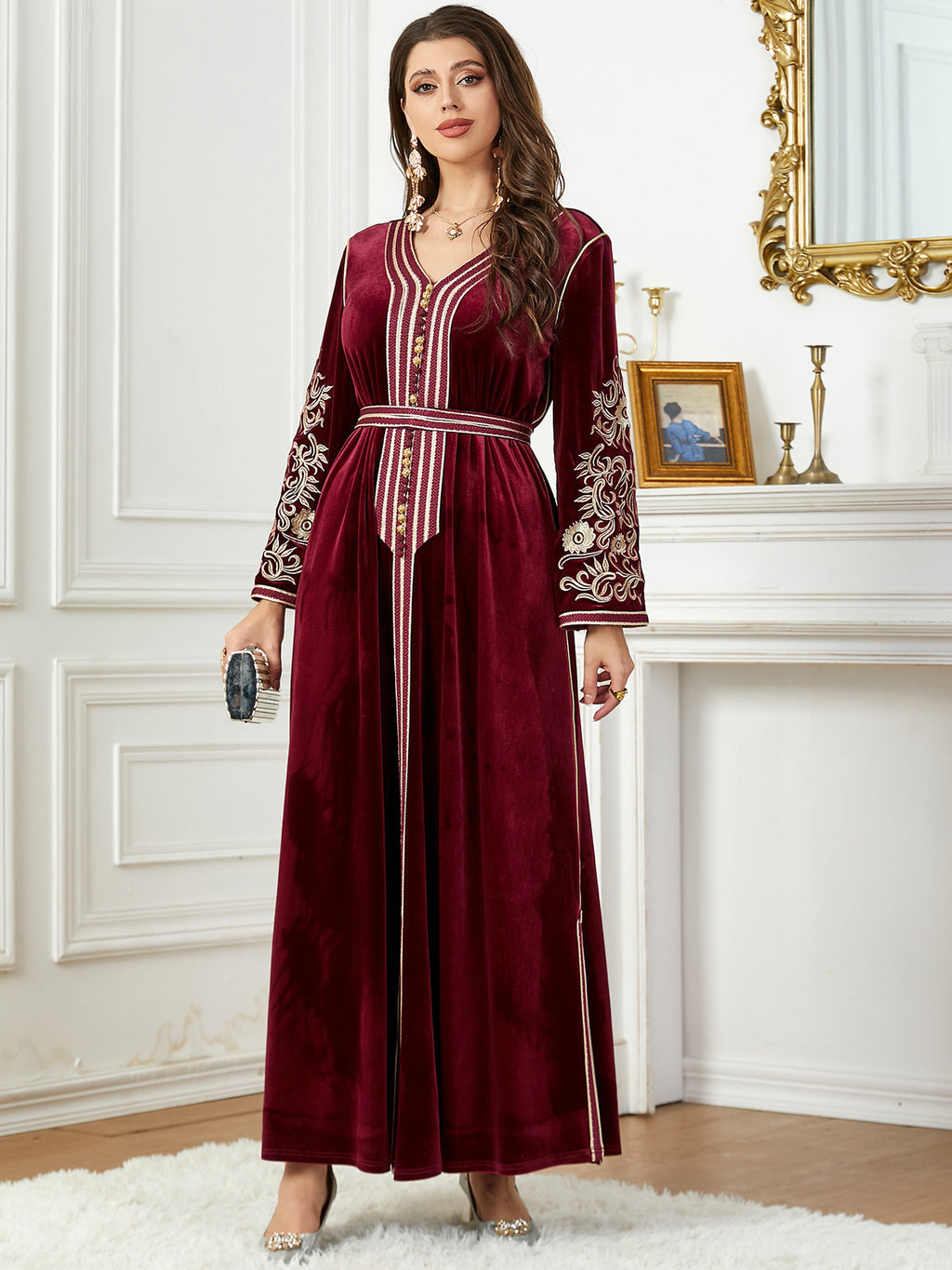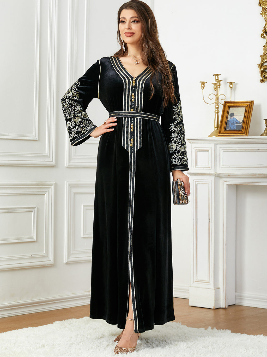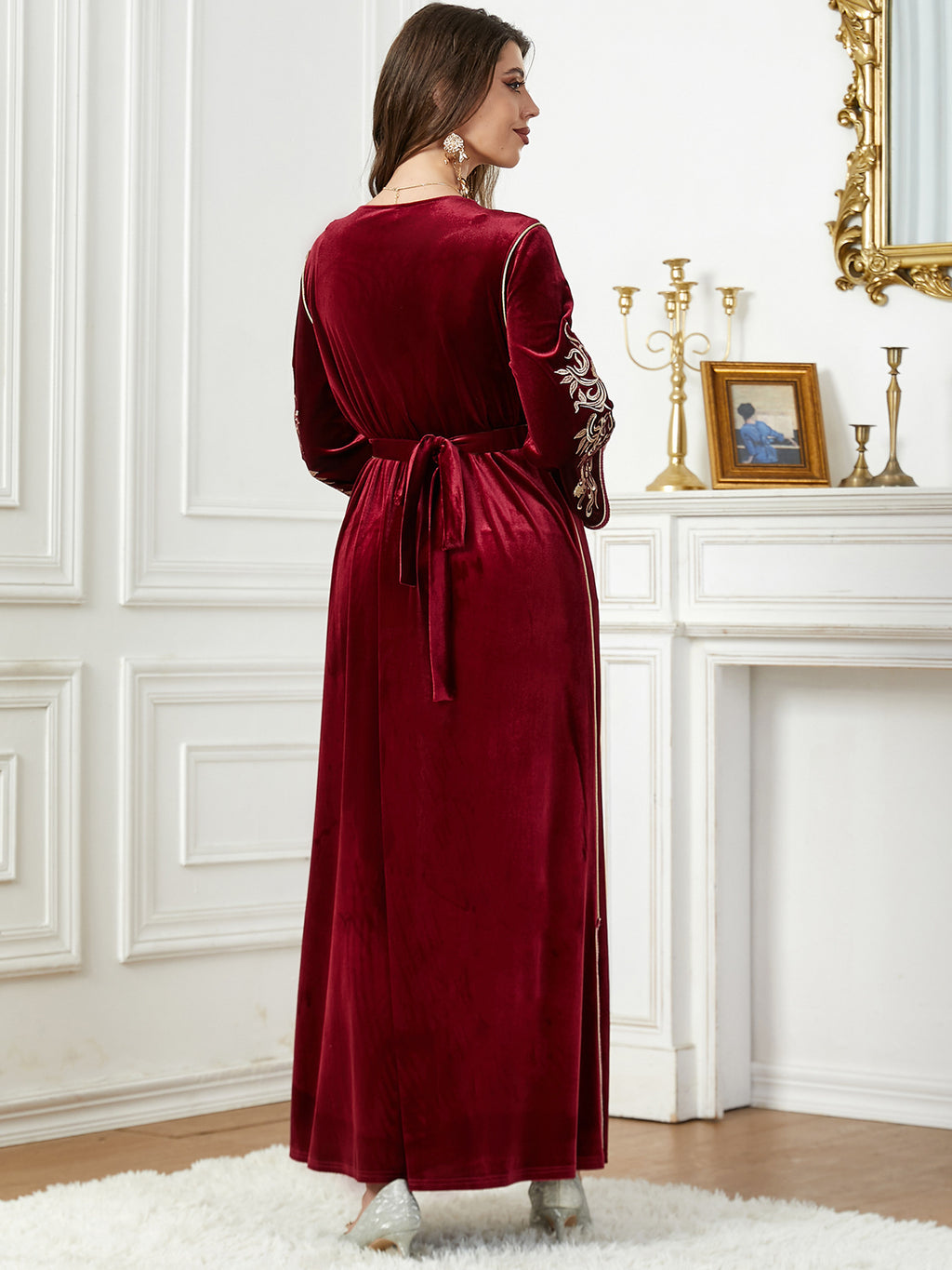 Women's Long Sleeve Velvet Maxi Dress with Gold Detailing
