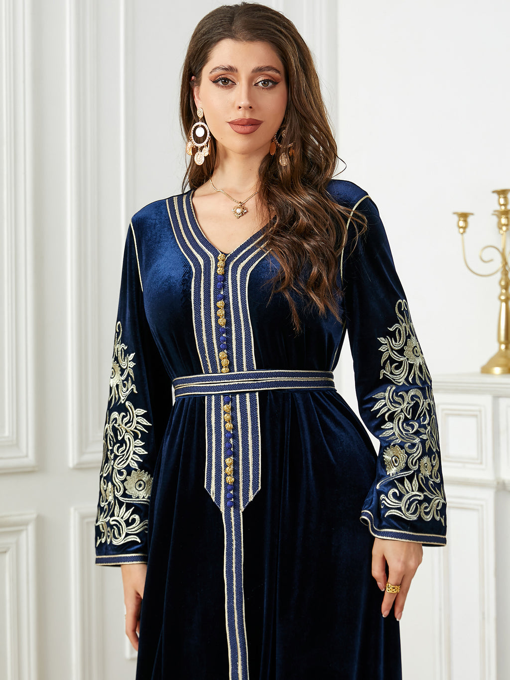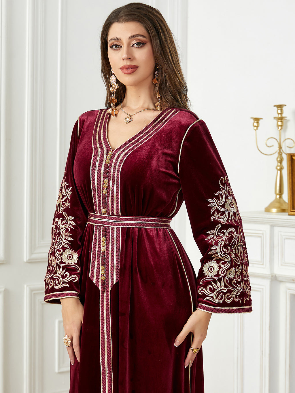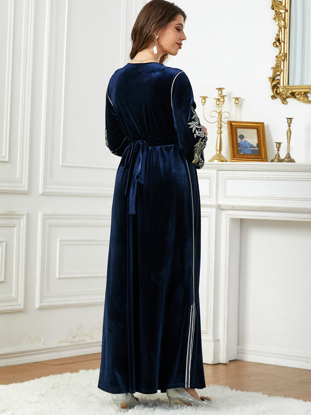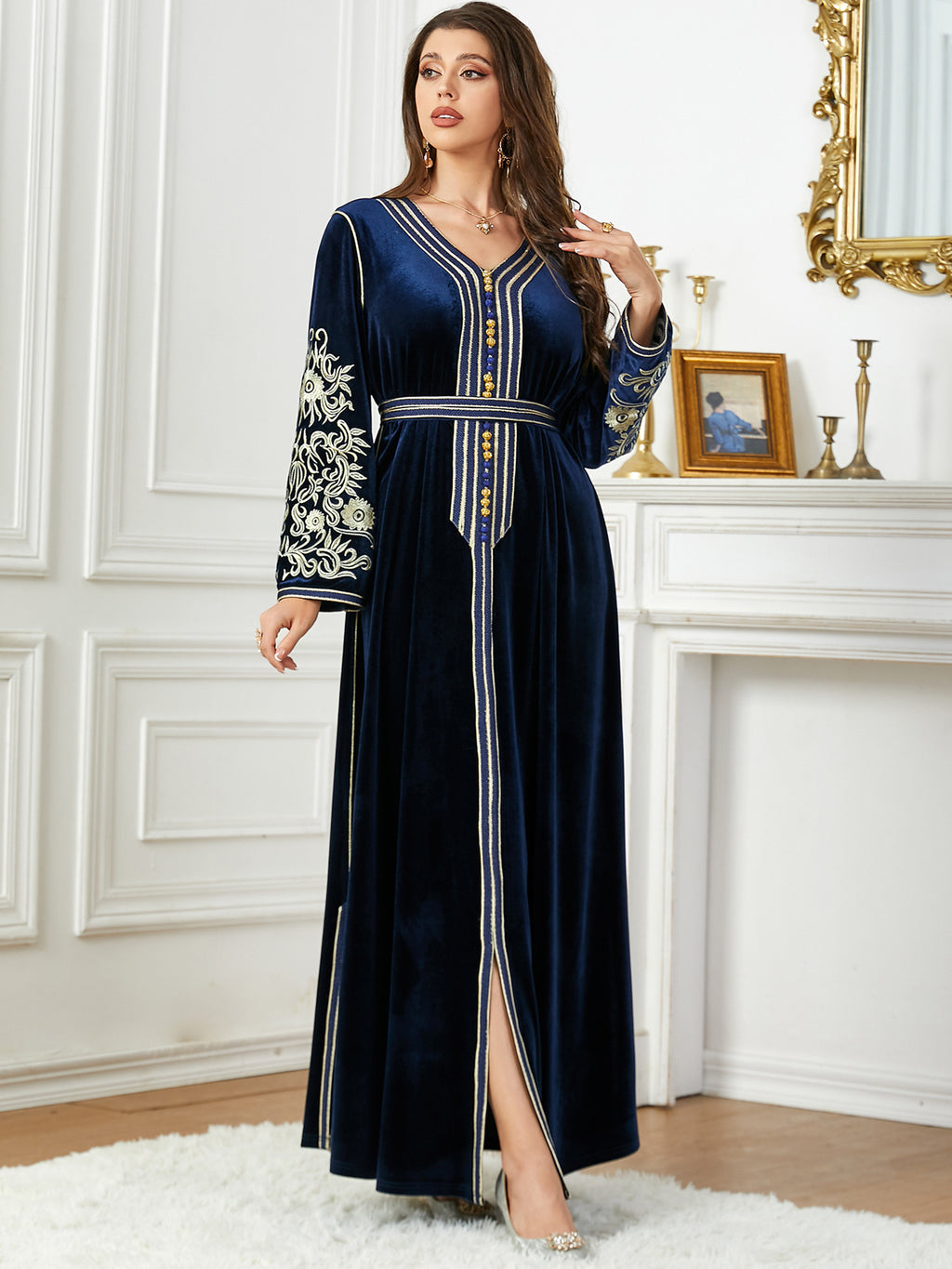 Women's Long Sleeve Velvet Maxi Dress with Gold Detailing