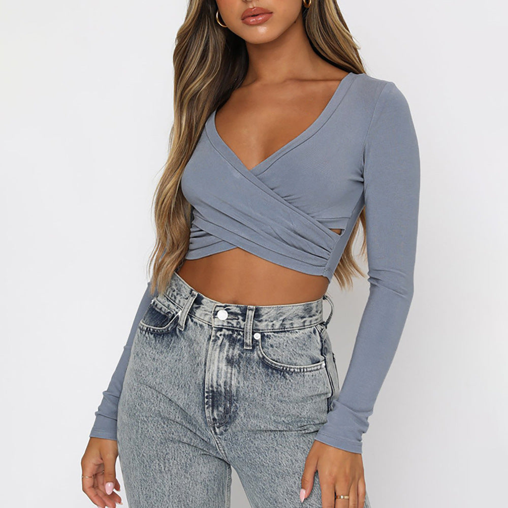 Women's Long Sleeve Wrap Style Crop Top with V Neck